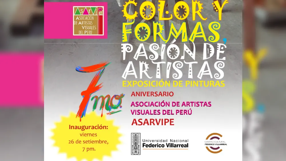 La Asociación de Artistas Visuales del Perú (ASARVIPE) conmemora su 7º aniversario con la inauguración de la muestra colectiva “Color y formas, pasión de artistas”, que abrirá sus puertas el viernes 26 de setiembre a las 7:00 p.m. en la Galería del Centro Cultural Federico Villarreal, en el Cercado de Lima.