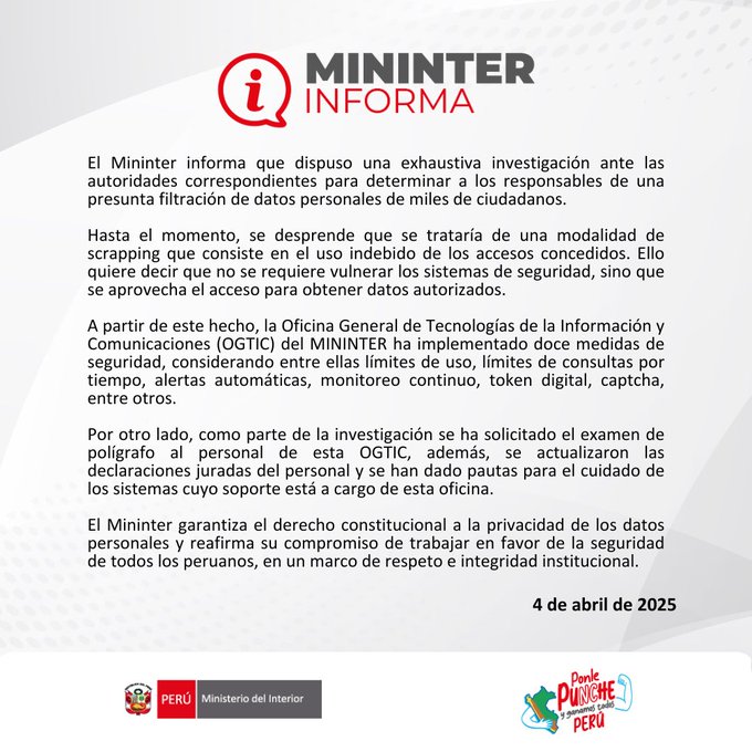 La medida fue tomada tras un pronunciamiento del Reniec, que rechazó la versión de un hackeo masivo a sus servidores —difundida por un portal periodístico digital— y señaló como responsables al Mininter y al Ministerio de Trabajo y Promoción del Empleo (MTPE) por supuestos usos inadecuados de su sistema. En respuesta, el Mininter afirmó que el problema no radicaría en una vulneración externa, sino en una técnica conocida como “scraping”, que consiste en extraer datos aprovechando accesos legítimos.